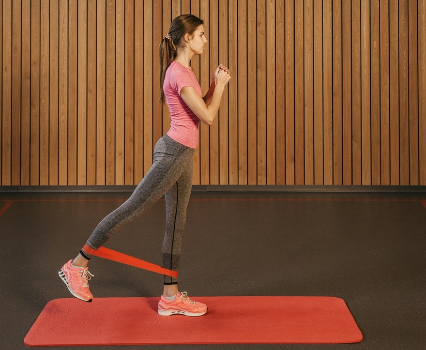 • Coloque uma banda elástica pequena por baixo dos joelhos e afaste os pés ao nível das ancas, com as pernas ligeiramente fletidas;
