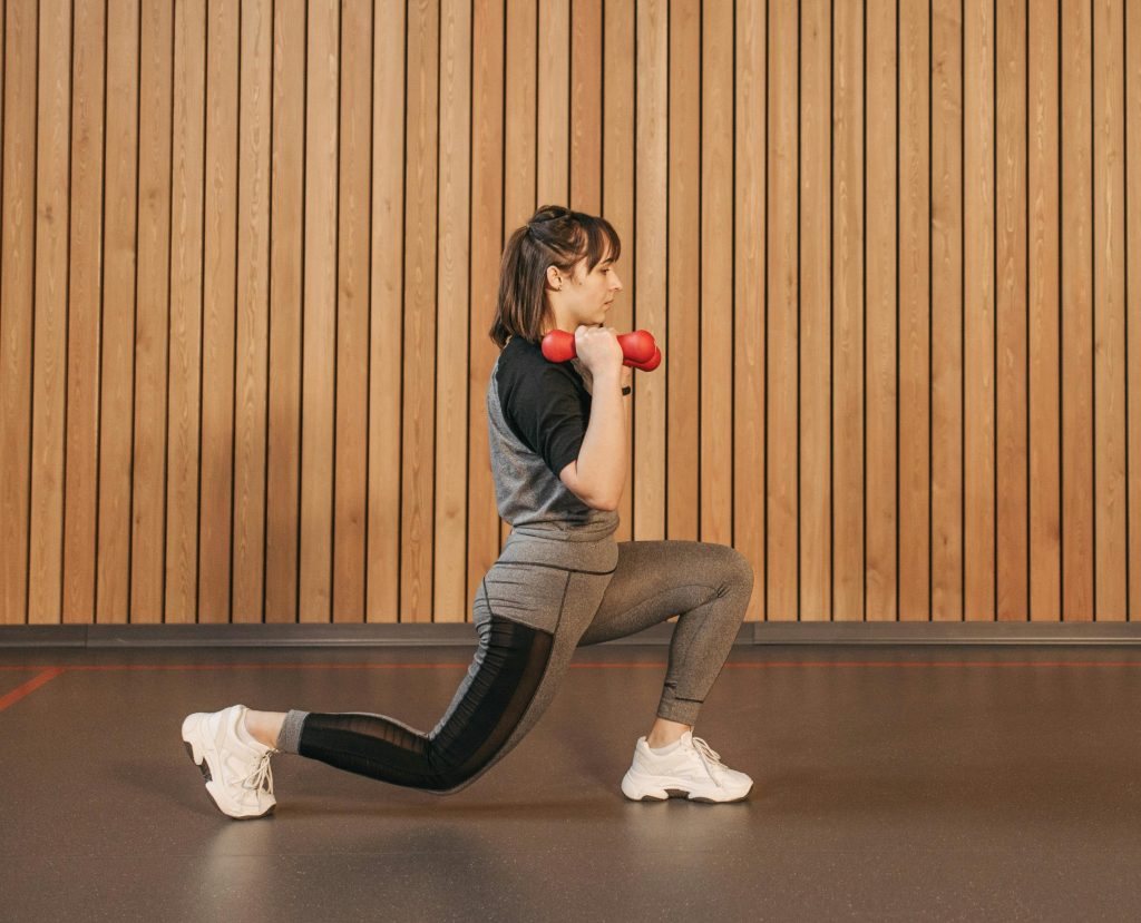 • Erga-se sem chegar a apoiar o pé direito e mova-o para trás, fazendo imediatamente um lunge inverso. Regresse à posição inicial. Realize o exercício entre 10 a 12 vezes e mude de lado.