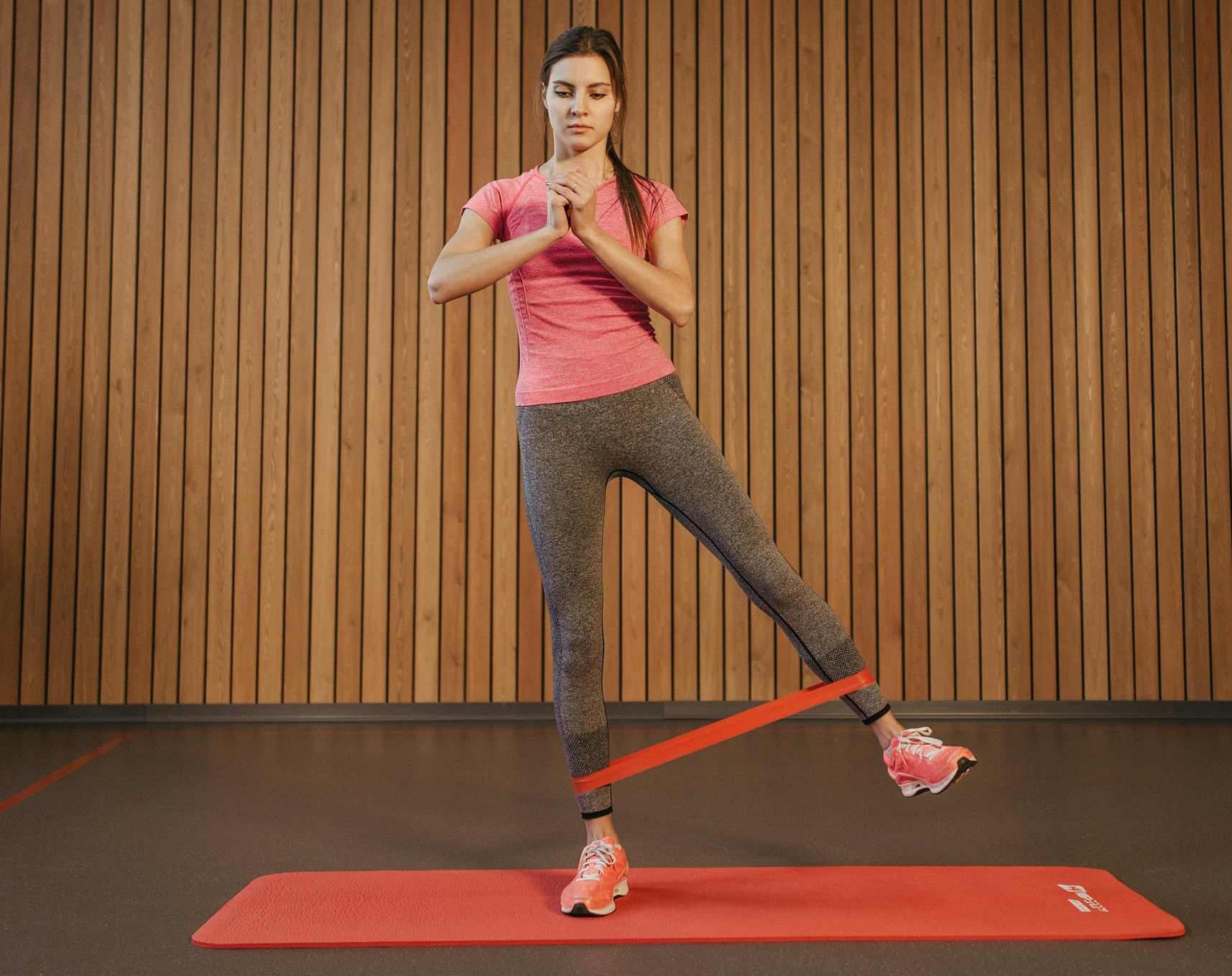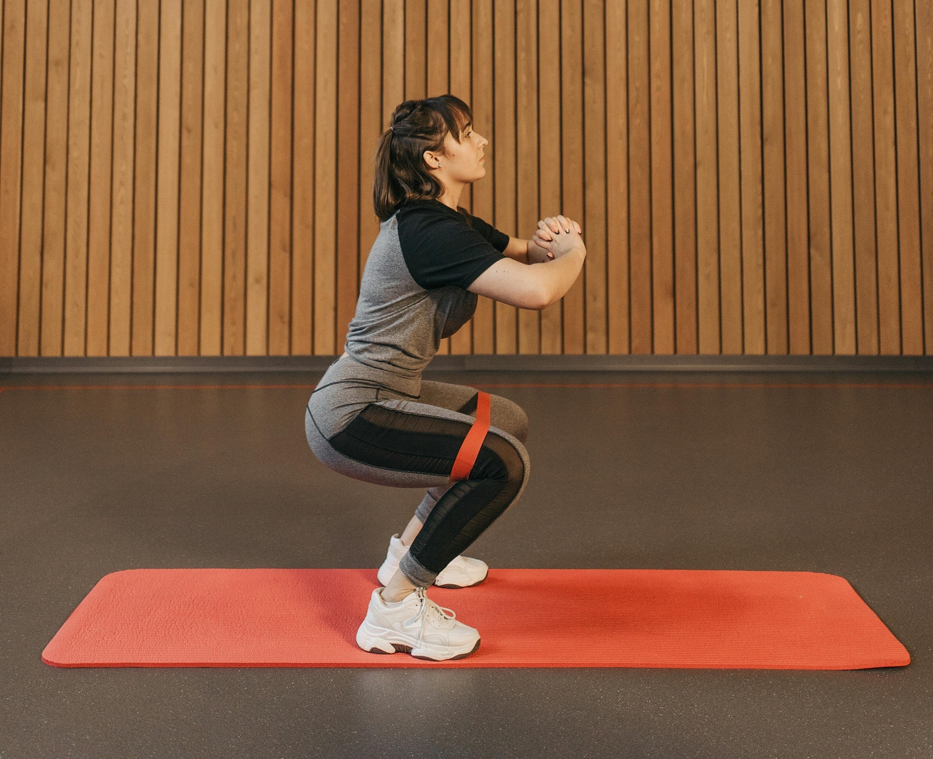 • Coloque uma banda elástica pequena por baixo dos joelhos e afaste os pés ao nível das ancas, com as pernas ligeiramente fletidas;