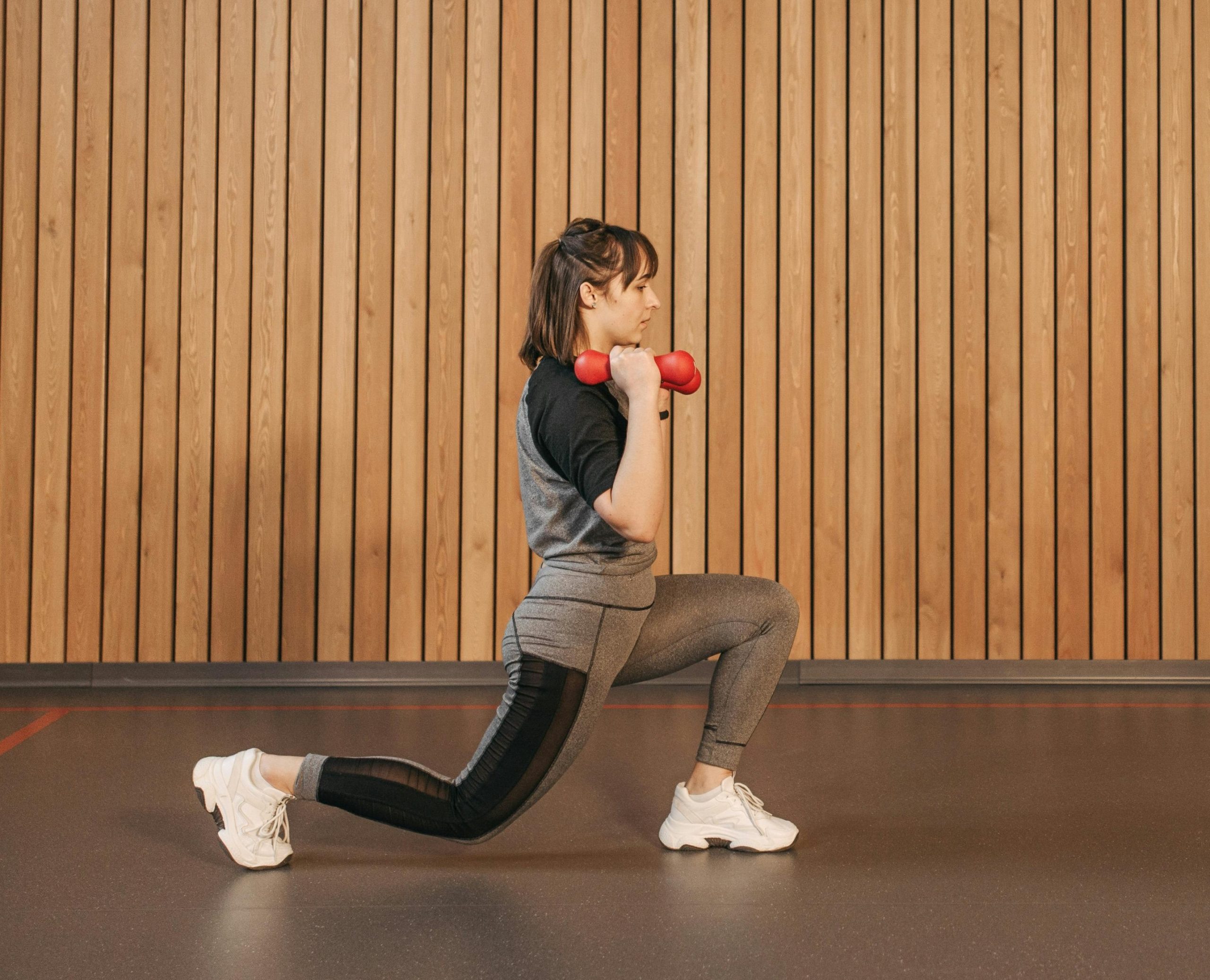 • Dê um passo grande para a frente com o pé direito e faça um lunge com as duas pernas fletidas em ângulo reto;