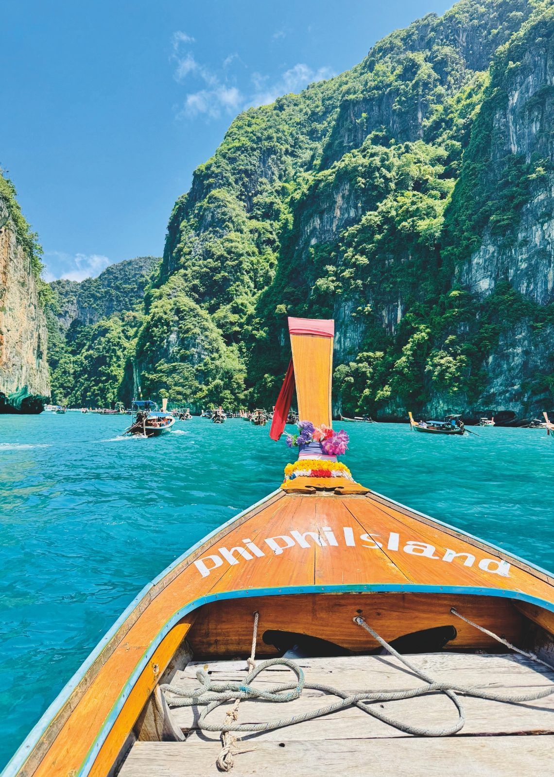 Começámos por dar uns mergulhos na incrível Bamboo Island (opcional em tours premium), que é uma ilha pequena com areia branca e águas transparentes. Dali à Pileh Lagoon foram uns minutos: uma autêntica baía azul-turquesa rodeada de falésias imponentes. É uma das paisagens ou postais mais conhecidos da Tailândia. Daí fomos fazer snorkeling em Loh Samah Bay e depois almoçámos em Phi Phi Don (a ilha principal), que conta com bastante comércio, hospital e alguns hotéis. Mas o que veio a seguir foi, para nós, o momento do dia: a hora de sairmos da sala de cinema onde há 20 anos assistimos a The Beach e pisarmos aquela praia de sonho.