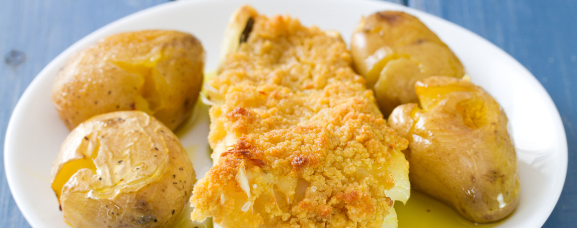 3. Coloque o bacalhau num tabuleiro de forno e cubra com a mistura de broa. Disponha as batatas à volta do bacalhau, regue com o restante azeite e salpique com sal