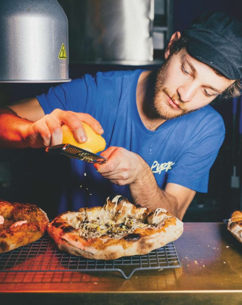 O menu divide-se entre snacks, pizzete e pratinhos, mas a ordem dos pedidos é aleatória. Focaccia de fermentação natural com manteiga de sálvia; crudo de atum com tomate e habanero; brocamole, uma revisitação do guacamole onde os brócolos do sul da Itália substituem o abacate; a pizzeta de creme verde, kale e stracciatella fumada e o cheescake com pistácio de Bronte e manjericão são algumas das propostas a provar.