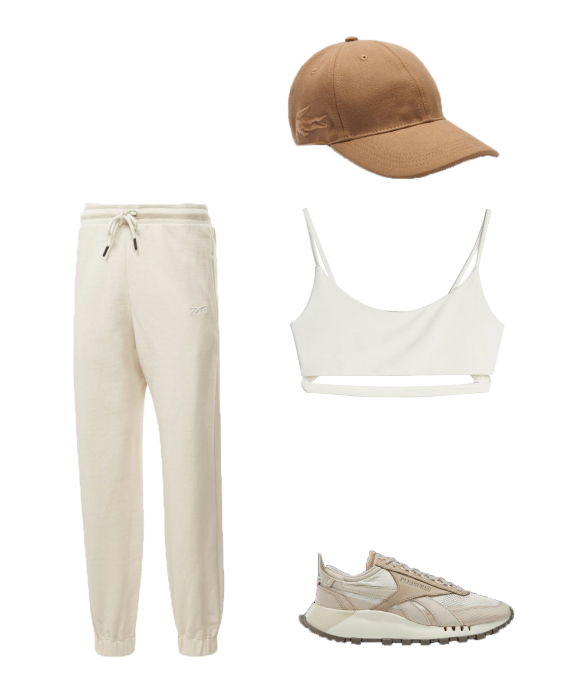 Soutien, Bershka, 7,99€ Calças, Reebok, 299,95€ Ténis, Reebok, disponíveis a partir de 22 de agosto Boné, Lacoste, 65€