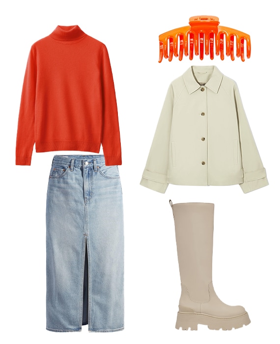 Sugerimos que opte por uma gabardina curta para os dias chuvosos, que pode conjugar com uma saia de ganga e botas de cano alto próprias para a chuva (sem nunca esquecer os collants). Para não ter frio, acrescente uma camisola de malha de gola alta num tom forte, e finalize com uma mola da mesma cor (assim, consegue ter o cabelo arranjado todo o dia).