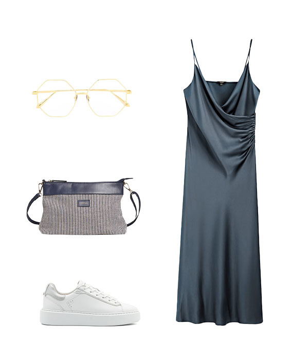 Se um vestido de cetim drapeado é sempre indicado para uma ocasião mais formal, então, neste caso, vamos desconstruir essa ideia e juntar-lhe uns ténis e uma carteira de pano. Um blusão de ganga ou um trench comprido também seriam bons complementos para este look.