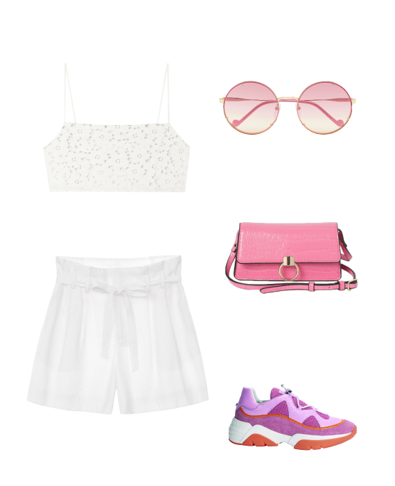A um conjunto simples como uns calções e um crop top, juntam-se alguns acessórios mais coloridos, que, entre eles, fazem pandã. É um conjunto perfeito para um passeio, pois não é nada muito formal.