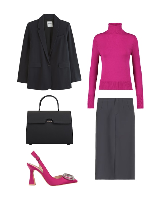 Não, ainda não nos cansámos da Barbie. Embora a febre com a boneca mais icónica do mundo tenha passado, o rosa continua a elevar as temperaturas nesta estação. Aqui, funciona como ponto de cor num coordenado pensado para o escritório, com uma saia lápis em cinzento e um blazer oversized preto.