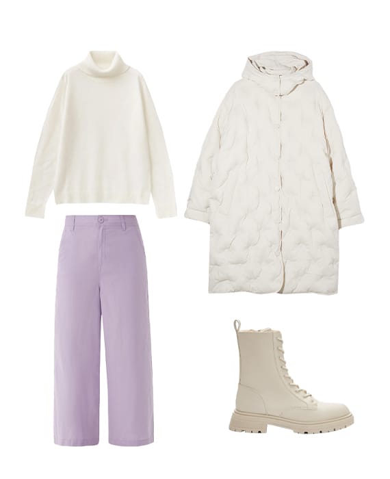 A premissa de que o branco é do verão e o preto do inverno está mais que datada. Os tons sóbrios e suaves são também usados na estação fria e provamos-lhe que podem ser conjugados entre si. Escolhemos o lilás como um dos tons favoritos da estação e combinámo-lo com botas, uma camisola e um anoraque branco, como a neve, resultando numa harmonia perfeita.