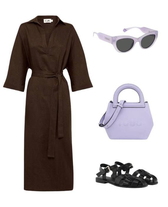 Em homenagem à figura mítica dos Santos na capital, este look junta um vestido100% de linho a umas sandálias fechadas à pescador, ou, se preferir, à Santo António. Combine o conjunto com uma carteira lavanda e uns óculos de sol no mesmo tom.