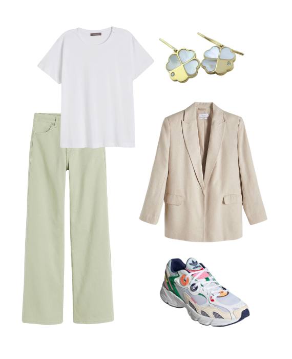 Inspirado na cor de um manjerico, este coordenado leva o verde para umas calças confortáveis, cool e descontraídas, ideal para quem gosta de simplificar na hora de sair de casa. Combine com uma t-shirt branca e, nos pés, uns ténis, ou não seriam as noites de verão longas. Caso o tempo arrefeça, adicione um blazer bege.