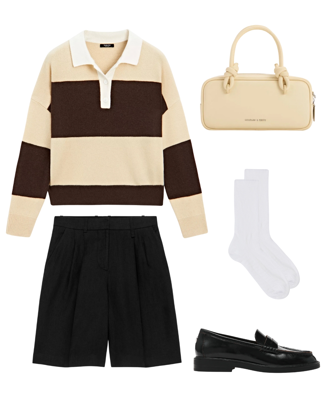 Se, antes, as meias e collants não serviam mais que para nos aquecer nos dias mais frios, agora, são feitas para ser vistas, muitas vezes até como as protagonistas dos coordenados. Aqui, devido às riscas da camisola, optámos por preferir umas lisas, brancas, para um look mais equilibrado. Devido ao material dos calções, escolha umas botas ou botins.