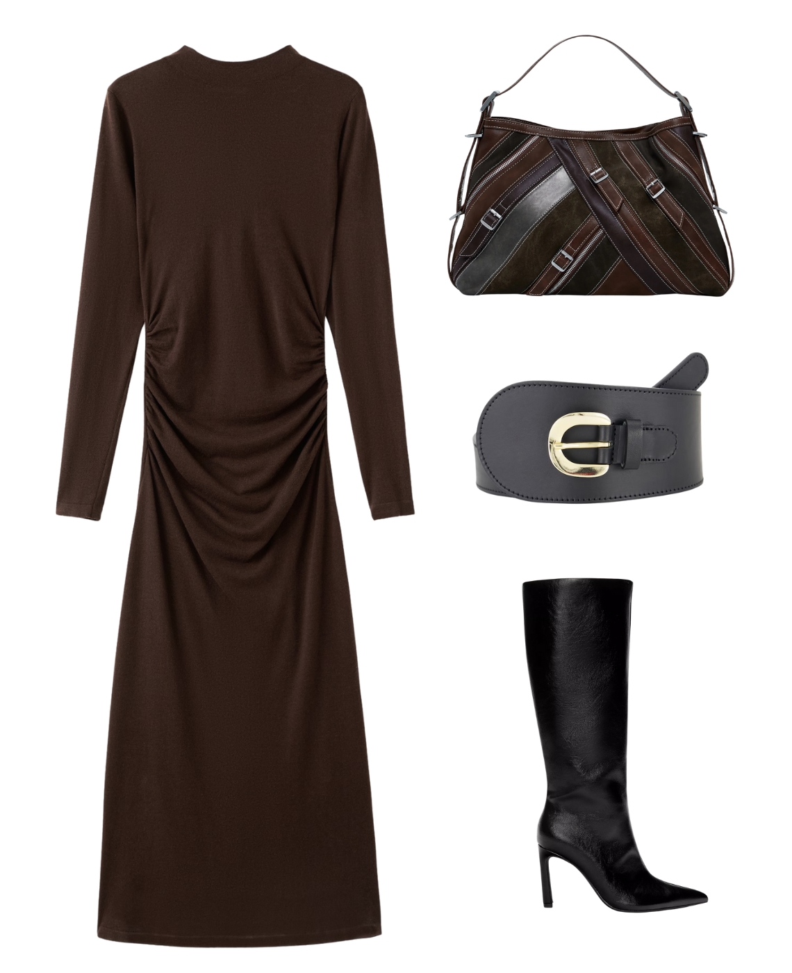 Este, sim, é um look para sair à rua. Aliás, é mesmo um coordenado para uma saída à noite ou adequado ao escritório. A culpa é das botas, elegantes, de cano alto e salto, assim como do cinto, que define a silhueta, chamando a atenção para a zona mais estreita do corpo.