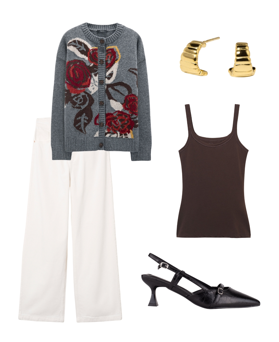 Os cardigãs saíram do conforto do nosso lar e assumiram um lugar de protagonismo na rua. Para este conjunto escolhemos um top castanho, que contrasta com o branco das calças com pinças, para um look adequado, por exemplo, para o trabalho ou um café com as amigas.