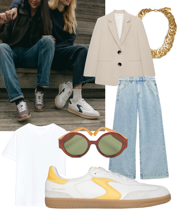 Sugestão de look: combine as Skechers Court & Classics com uns jeans wide-leg ou umas calças de alfaiataria relaxed com uma t-shirt branca e um blazer estruturado. Para um toque extra, acrescente uns óculos vintage. Um look que acompanha o seu ritmo, confortável, leve e com um toque vintage. Perfeito para o dia a dia, mas também cool para um final de tarde na esplanada com as suas amigas, para usar nos festivais que se aproximam, para assistir a um concerto ou desfrutar de um cocktail numa sunset party.