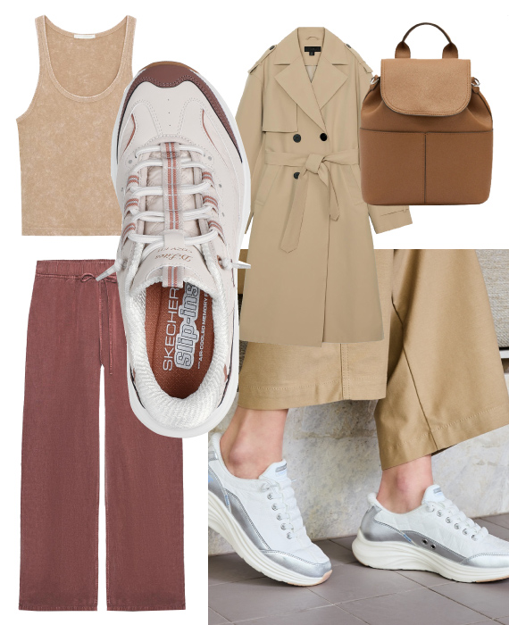 Sugestão de look: Combine as Skechers Cozy Fit com umas calças largas, um top de cor nude e um trench coat leve. Este look é ideal para aqueles dias longos, not-stop, que começam cedo no escritório e só termina numa saída para jantar. Ou para levar de viagem, porque é um modelo que se adapta a vários momentos, programas e ocasiões. Com peças mais formais assume um look casual elegante, se combinado com peças mais desportivas, assume um look atlheisure.