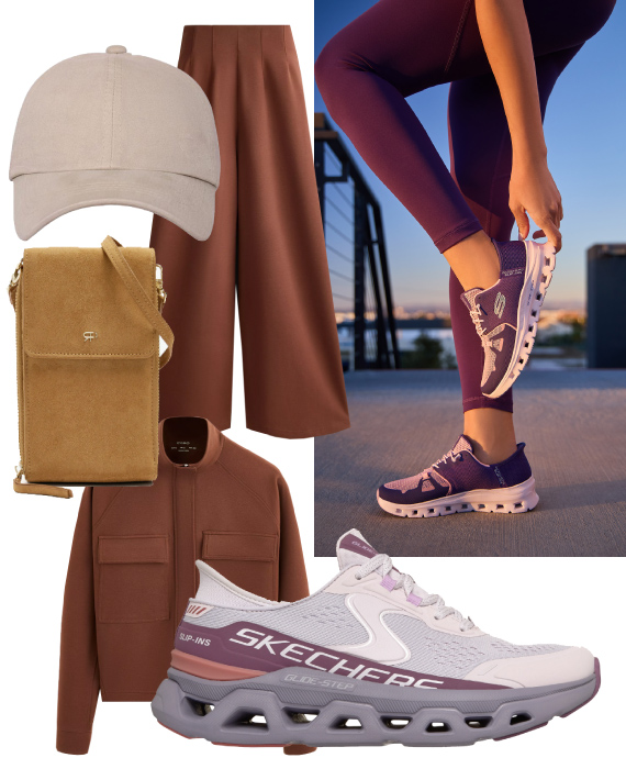 Sugestão de look: Combine as Skechers Glide-Step com um conjunto de treino e uns bons acessórios.