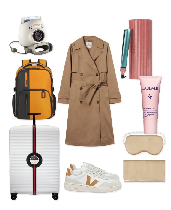 Trench coat, Decenio, 199,95€ Máquina fotográfica Instax Pal, Fujifilm, 99,99€ Prancha Styler Platinum+ Dreamland, GHD, 309,99€ Resveratrol Lift Creme Contorno de olhos, Caudalie, 39,90€ Mochila para portátil 15.6 polegadas, Samsonite, 205€ Máscara de dormir Oyster Ivory Silk Satin, Olivia von Halle, 115€ Ténis, Veja, 165€ Mala de viagem, Samsonite, 395€